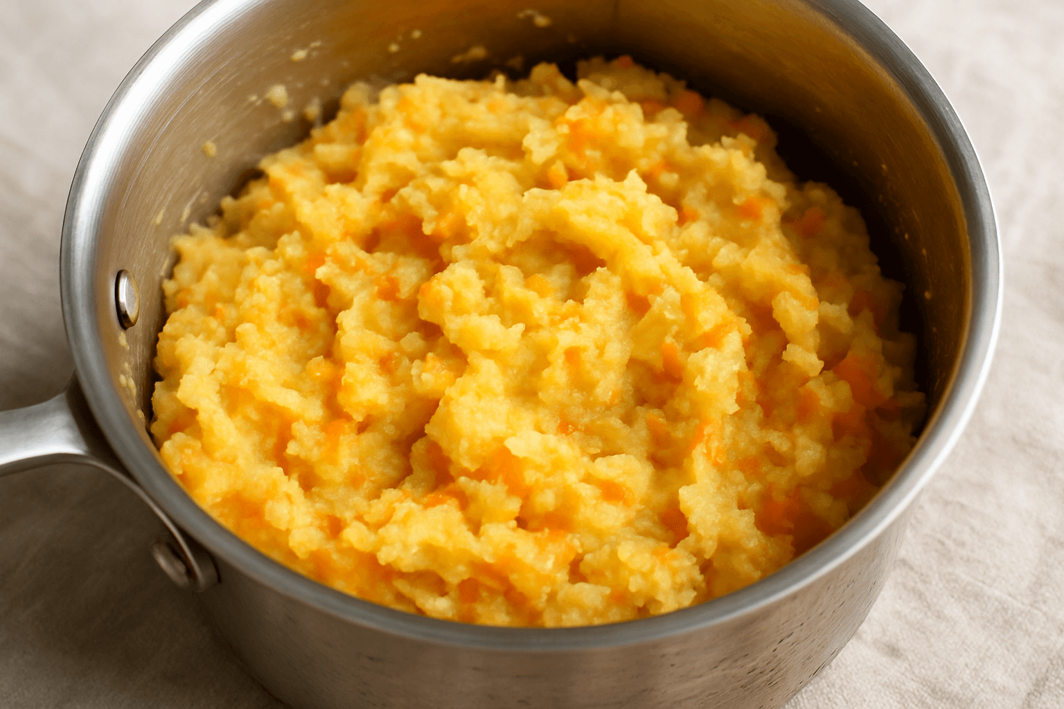 Schil de aardappels, snijd ze in gelijke stukken en kook ze in gezouten water in ongeveer 20 minuten gaar. Voeg na 10 minuten de stukjes wortel toe aan dezelfde pan, zodat ze samen gaar koken.